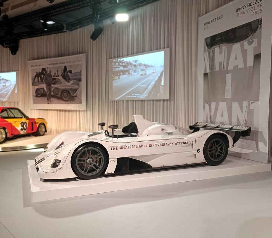 Then the stand jumps to 1999 with Jenny Holzer’s BMW V12 LMR, and the vibe shifts again. In your photo, the car sits low and long, finished in white, with bold text along the flanks. The wall panel behind it carries the same “WHAT I WANT” language, which makes the whole corner feel like an installation rather than a display.